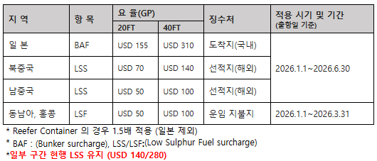 [공지] 한국 수입화물 26년 1분기 및 상반기 부대비 징수 안내 (저유황 유류 할증료)